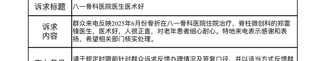 (市长热线反馈文件) “原来是您打的市长热线啊!”骨七科(脊柱微创科)的郑雷锋医生在电话这端又惊又喜。 (郑雷锋医生的生活照) 今年7月初,成都八一骨科医院收到了一封特殊的“市长热线”反馈文件,标题写着:“八一骨科医院医生医术好”。工单中,来电人特别表扬郑雷锋医生技术好、服务暖,并希望相关部门予以核实表彰。然而这封工单既未留下姓名,也没有联系方式,成了一封“找不到主人”的表扬信,在医院的“信箱”里静静滞留了两个多月。 直到近日,郑医生在对康复患者进行例行电话回访时,75岁的李女士忍不住说:“郑医生,我上次打了市长热线表扬您!您对我们老年人这么好,我不知道该怎么感谢,想了很久才想到这个办法……” 电话那头,李女士语气感动地说,年纪大了,难免常要进出医院,而郑医生总是轻声细语、耐心体贴,让她感到特别安心。“一句谢谢太轻了,我就想用‘正式’一点的方式表达认可。” 一通没有留名的热线,一句想了很久的“谢谢”,成了75岁老人最真挚、最庄重的致意。这也让郑雷锋医生感慨万分:“其实我们只是做了应该做的,但患者却如此郑重地回应,这份心意更值得我们珍惜。” 有时,温暖就在这样的“找不到人”的表扬里静静生长,也在不曾期待的回应中,圆满落地。 这封感谢信, 来自9病房全体“病友” (患者送的感谢信) 近日,下肢科2002年出生的年轻护士何婧,收到了一封特别的感谢信——写在一张粉色的信纸上,字迹工整,情意真挚。而更让人动容的是,这封信并非来自某一位患者,而是代表了下肢科9病房全体病友的共同心意。 (护士何婧生活照) “你用温暖的笑容和耐心的守护,让我们倍感安心。无论是深夜的轻声问候、输液时的细致叮咛,还是面对病痛时坚定的鼓励,都让我深深体会到白衣天使的责任和温度!”信中这样写道。 执笔的是一位30多岁的患者。他细心观察到,这位像“邻家妹妹”一样的小护士,把温暖带给了病房中的每一个人: 对50多岁高烧不退的病友,每隔一两个小时就主动进去探视、关心; 哪怕连续值了两三个夜班,也依然耐心亲切、笑容不减; 她不仅照顾身体,更用乐观细腻的能量,点亮了整个病房的抗病勇气。 一句“感谢你对下肢科9病房无微不至的关怀与专业护理!”, 让这封信有了更重的分量—— 那不是一个人的感谢, 是一屋子被温暖过的人,共同的心声。 何婧后来不好意思地说:“其实我真的没做什么特别的,只是做了该做的事。”但她轻柔的脚步、真诚的问候,患者们都看在眼里,记在了心里。 有时,一句温柔的叮嘱、一个安抚的眼神, 就是照进病房里的一束光。 谢谢所有为何婧这样的白衣天使, 他们值得被看见、被铭记。 我们也欢迎您,在评论区分享你在【八一骨科】遇到的温暖医疗瞬间!