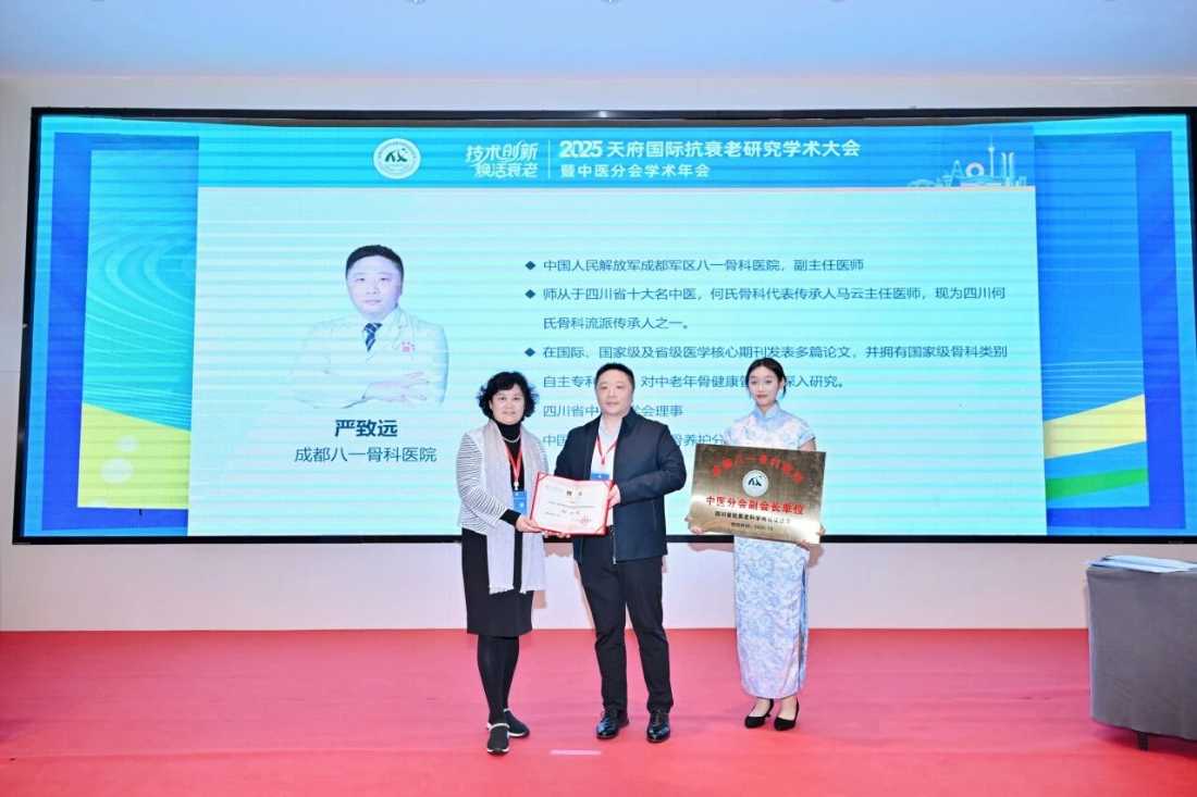 2025年10月17日—18日,2025年天府国际抗衰老研究学术大会在成都顺利举行,我院骨四科主任严致远副主任医师被推选为四川省抗衰老科学研究促进会中医分会副会长,同时严主任所在中医老年骨科与骨健康专委会被评为“四川省抗衰老科学研究促进会优秀分支机构-2025年度骨科匠心奖”。
